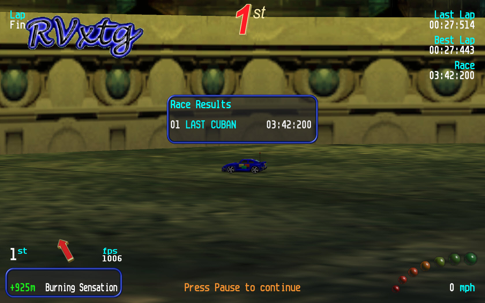 Track Review :- This is a fast track with lots of long curves. You can loose lots of time by taking the corners to fast or too wide. Track is a conversion from another format/console to RV. Overall this is made well and works fine too. Also a battle level variant is available via modification of track files. |