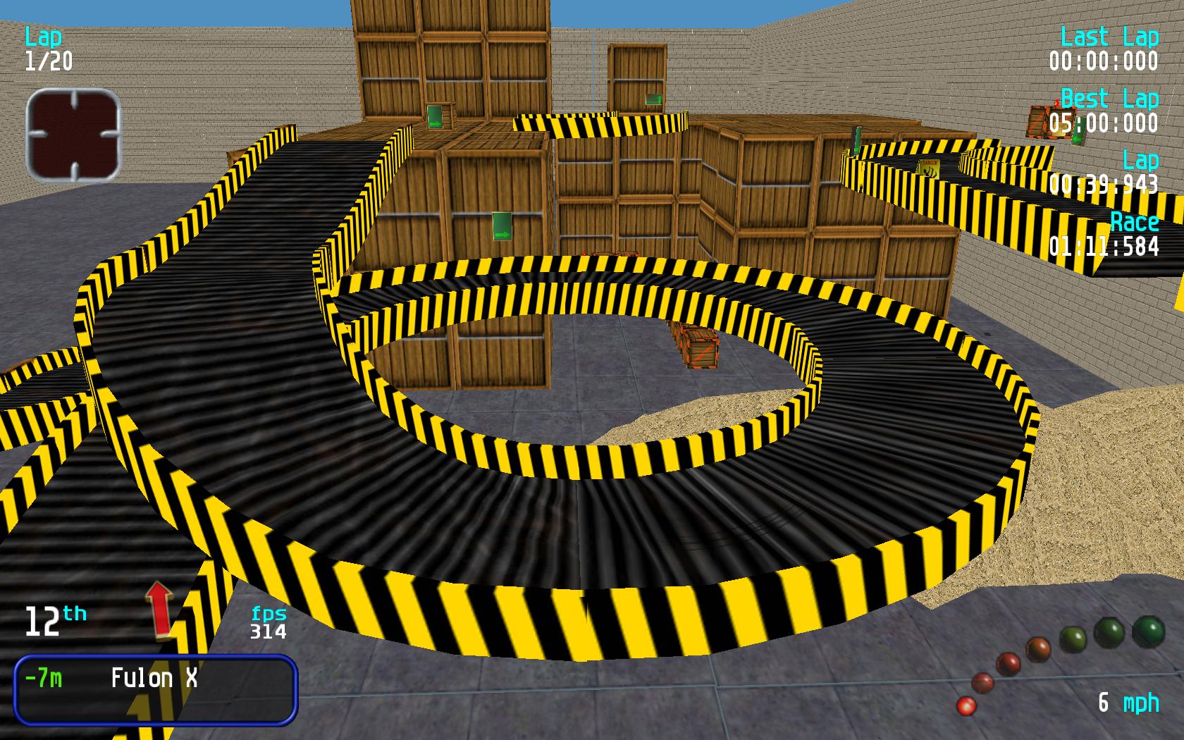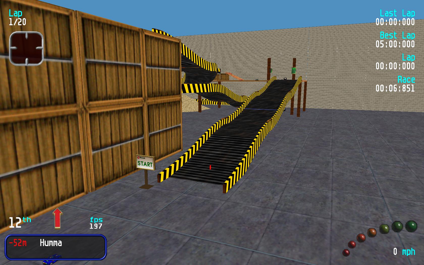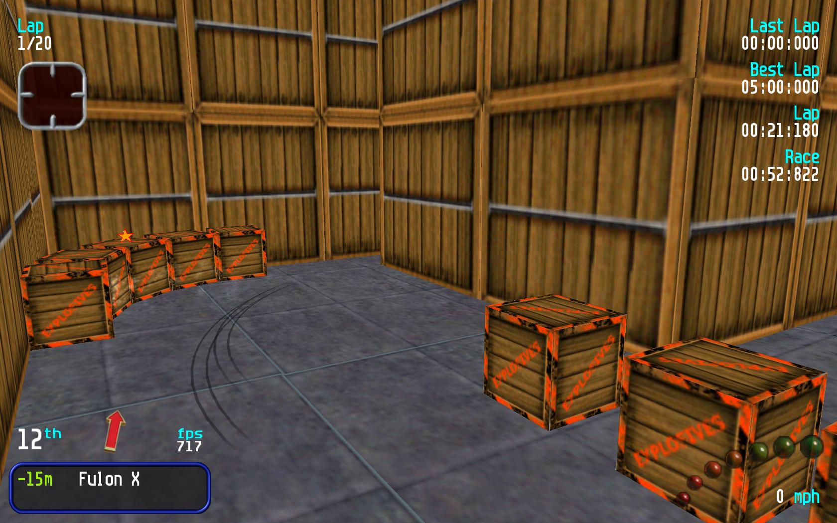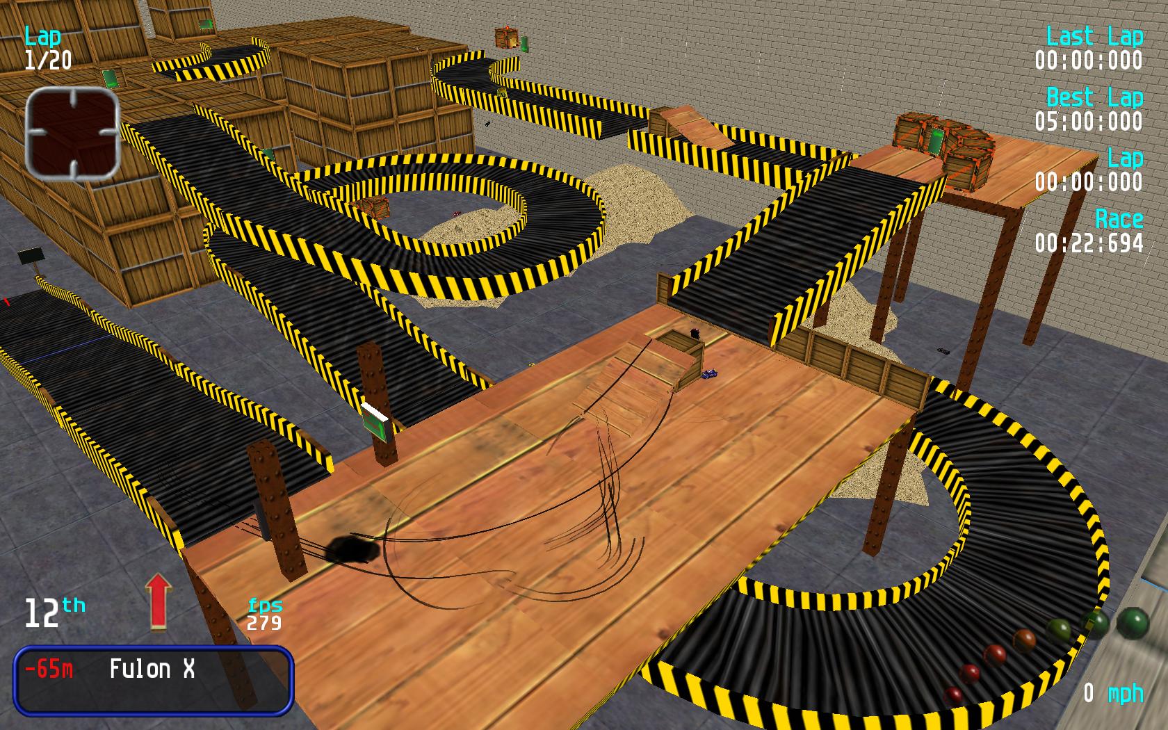 Track Review :- This a good warehouse style track that has been let down by a few glitches in the track. The worst is the one near the end but you can avoid the glitches by going to the left of the box before the ramp entry. I have tried a number of times the route on the right of the box and this way seems very hard to get right. If the glitches were removed then this would be a good warehouse track. The only think I would add is some objects on the last turn as the track only takes up about half of the area. Overall good track let down by a number of frustrating bugs. |