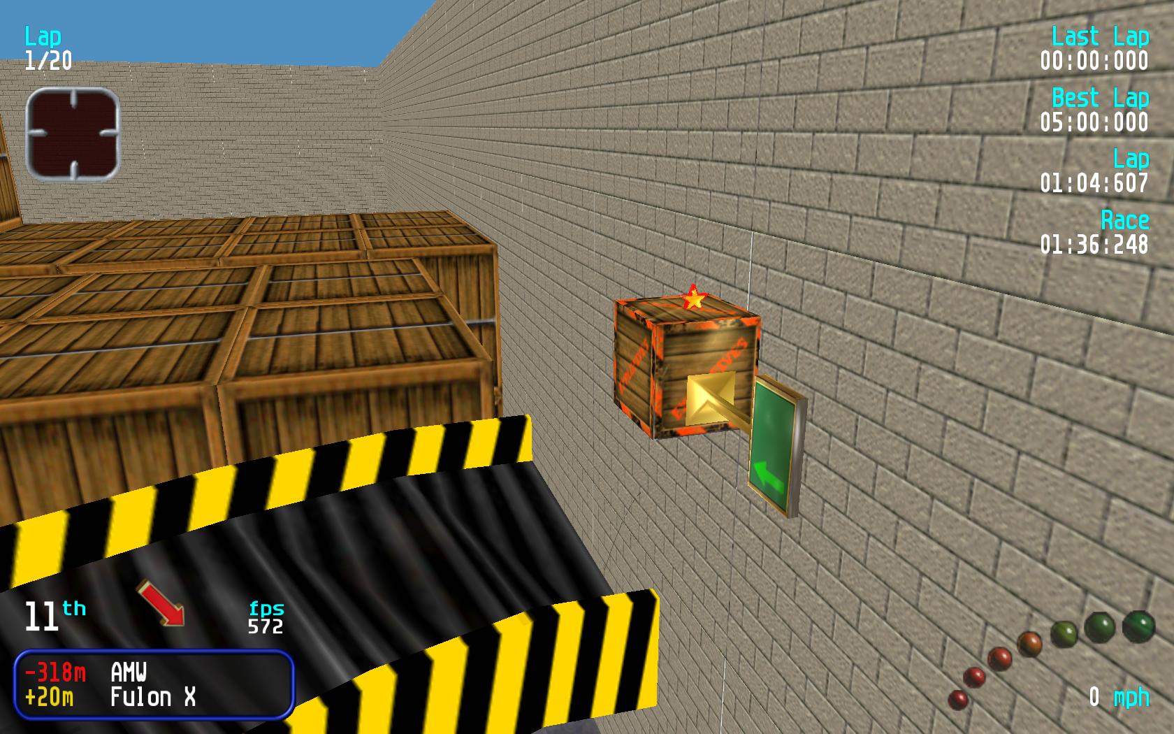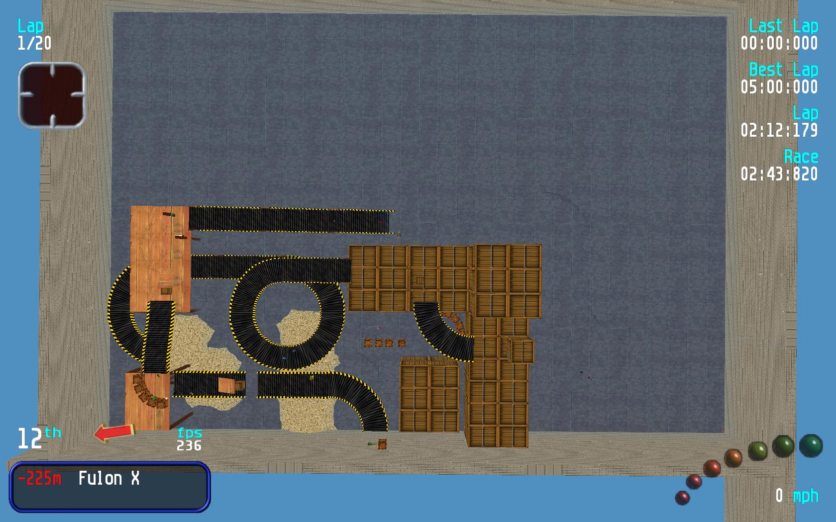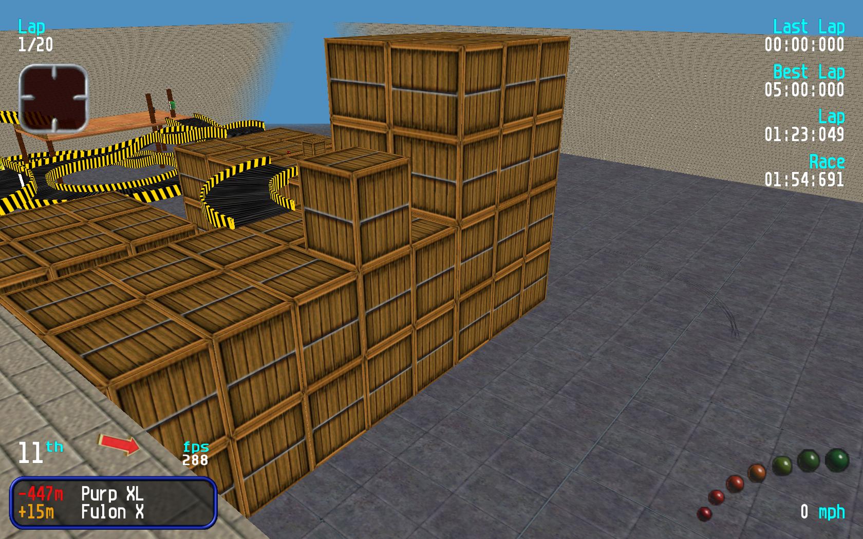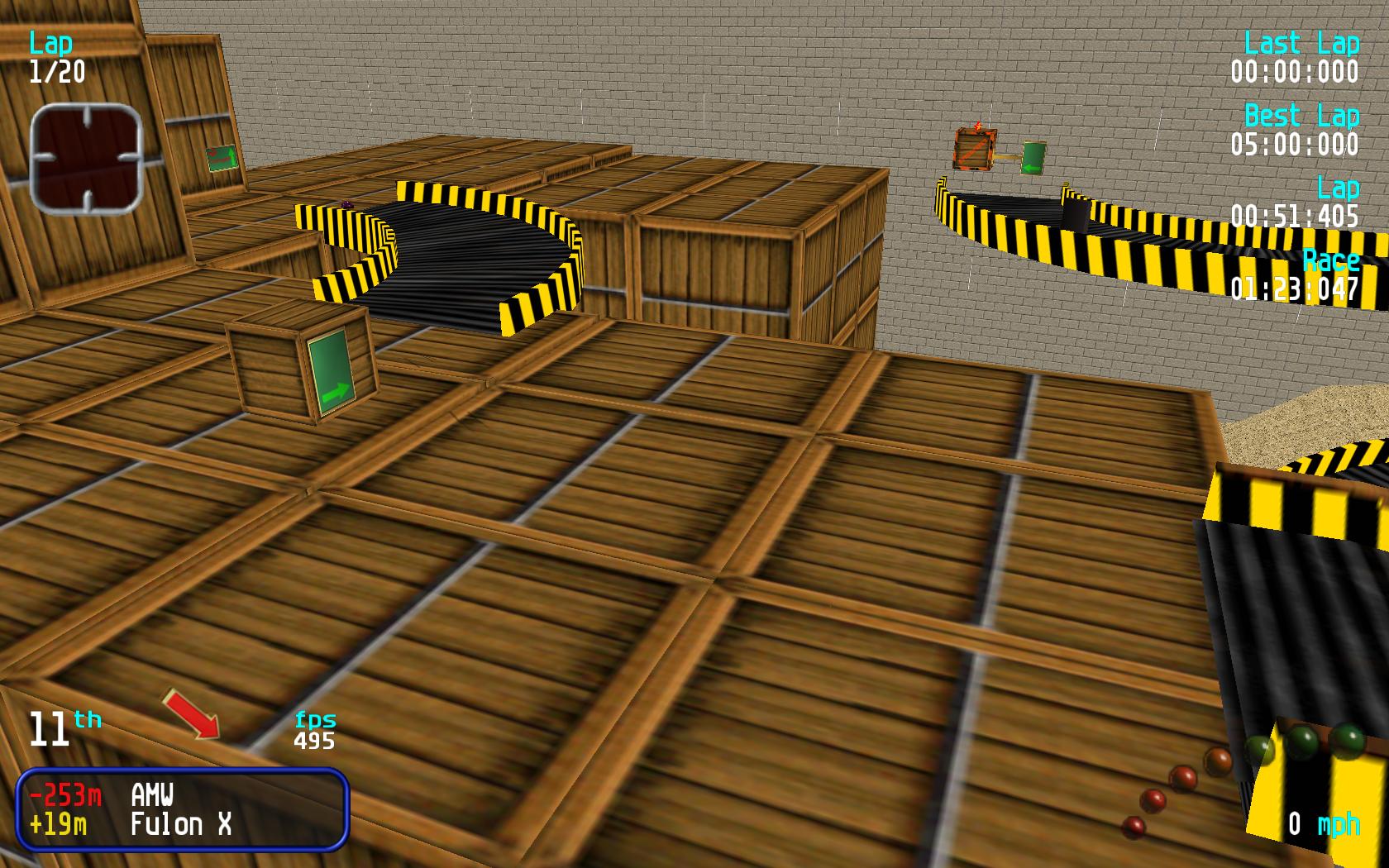 Track Review :- This a good warehouse style track that has been let down by a few glitches in the track. The worst is the one near the end but you can avoid the glitches by going to the left of the box before the ramp entry. I have tried a number of times the route on the right of the box and this way seems very hard to get right. If the glitches were removed then this would be a good warehouse track. The only think I would add is some objects on the last turn as the track only takes up about half of the area. Overall good track let down by a number of frustrating bugs. |