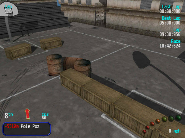 As you enter the court you will see some barrels on your right. Do a long wide turn around them as fast as you can.